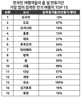 한편 전년 대비 가장 높은 검색 증가율이 높았던 여행지는 일본 규슈(160%), 서울(98%), 부산(91%), 상해(80%), 마카오(71%), 다낭(57%) 순으로 짧은 연휴 탓에 해외 여행 대신 국내에서 스테이케이션을 즐기는 여행객들이 증가하면서 국내 주요 도시가 높은 증가세를 보였다.