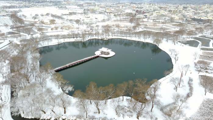 우리나라에서 가장 오래된 인공정원으로 알려진 궁남지가 하얀 눈꽃으로 뒤덮혀 있다.