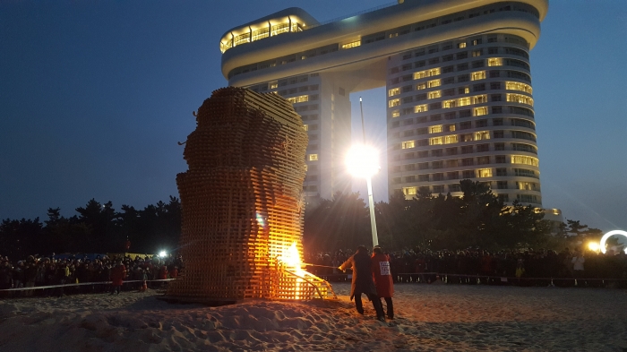 경포 해변을 배경으로 5m 이상의 대규모 조형물들이 해변에 자리잡자 지역 주민들은 물론 관광객, 국내외 언론들이 일제히 시선을 모았다. 바다로 옮겨진 미술관, 거기에 버닝(태움)을 준비하는 기상천외한 파이어 아트는 외국 언론들의 호기심을 자극하기에 충분했다. 미국 NBC 방송은 ‘황홀한 화재가 15분 후 해변에 전시된 예술 작품 3점을 불태워 버렸다’고 보도하며,버닝 퍼포먼스 현장을 위트 있게 중계했다. 관람객 중에는 2002 한일 월드컵 4강 신화의 주역인 히딩크 감독과 여자 아이스하키 남북 단일팀, 북한 응원단도 포함되었다. 특히 북한 응원단은 첫 나들이를 경포해변의 전시 현장을 찾아 흥미로운 관람을 이어갔다.
