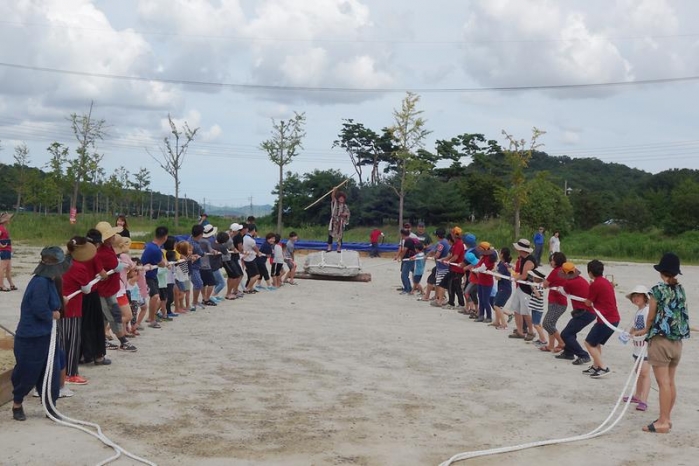 고인돌 밀당 체험여행에서 부족장을 중심으로 고인돌 끌기 체험을 하고 있다