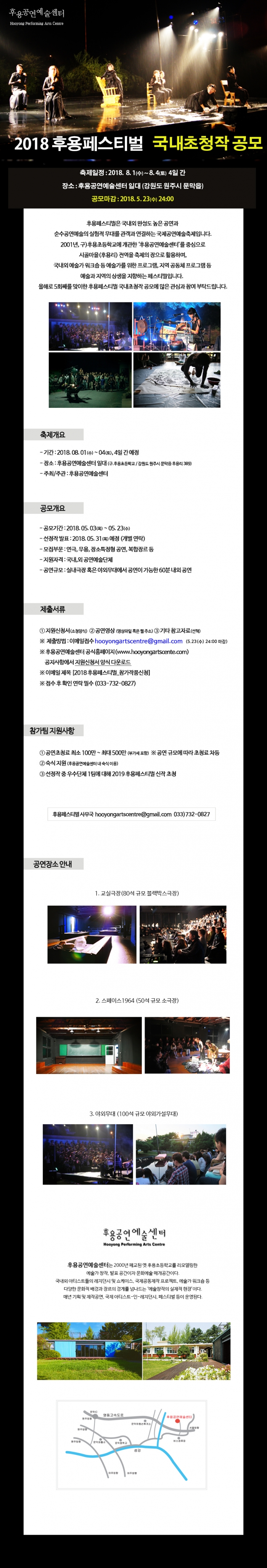 2018 후용페스티벌 국내외 초청작 공모분야는 연극, 무용, 장소특정형 공연, 복합장르 등이며, 실내극장 혹은 야외무대에서 공연이 가능한 60분 내외의 작품, 국내외 공연예술단체면 지원이 가능하다.