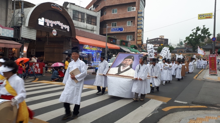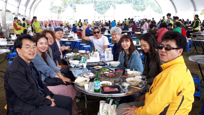 맞아요 퍼레이드 코스의 클라이막스, 축제장으로 으로 진입하는 밀양감 둔치 주차장 부스 걷기길 혼잡하여 ..