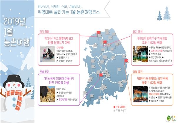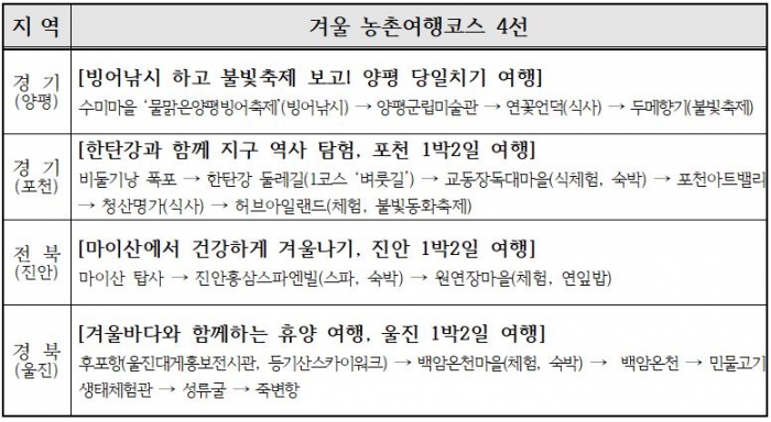 이번 농촌여행코스는 당일 또는 1박2일 일정의 총 4개 코스로 빙어낚시, 불빛축제, 온천, 겨울바다 등 겨울철 대표적인 놀거리와 볼거리로 구성되어 있다.
