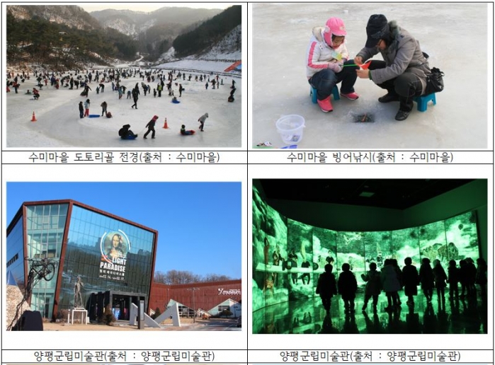 먼저 당일코스인 경기 양평 코스는 ‘물맑은양평빙어축제’ 빙어낚시를 시작으로 빛을 테마로 한 현대미술 전시 관람, 북한강이 내려다보이는 지역 맛집에서의 식사와, 불빛축제 관람이 이어진다.