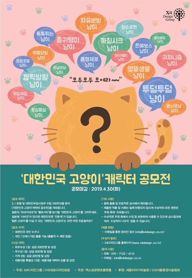 X4디자인그룹(대표 정석원)과 (사)내포디자인포럼(이사장 한기웅)은 3.1운동 및 대한민국임시정부 수립 100주년을 맞아 [‘대한민국 고양이’ 캐릭터 공모전]을 개최한다고 밝혔다.