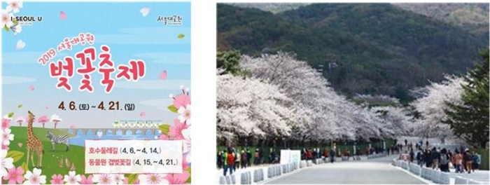 올 해 서울의 벚꽃은 4월 5일부터 본격 개화하였으며, 호수둘레길의 왕벚꽃 개화 후 2주일 후 겹벚꽃이 개화한다. 서울대공원은 서울지역보다 1주일정도 개화가 늦은 편이며, 개화에 오랜 시간이 걸린 만큼 화려하고 아름다운 벚꽃을 볼 수 있다. 호수 둘레길을 따라 핀 왕벚나무, 동물원 안의 겹벚꽂나무, 그리고 청계산 자락의 산벚나무 등의 벚꽃이 피어나면 어느 곳에서 찍어도 아름다운 사진을 남길 수 있다. 아름다운 벚꽃의 향연을 보고 싶다면 벚꽃이 만개할 것으로 예상되는 축제 둘째주인 13~14일쯤 방문하면 좋다.