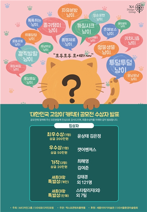 X4디자인그룹(대표 정석원)과 (사)내포디자인포럼(이사장 한기웅)은 일본의 ‘헬로키티’를 능가할 ‘대한민국 대표 고양이 캐릭터’를 뽑기 위해 진행된 [대한민국 고양이 캐릭터 공모전] 수상작을 20일 발표했다.