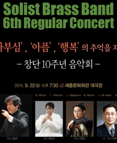 미리보기제6회솔리스트브라스밴드정기연주회가9월22일19:30세종문화회관대극장에서펼쳐진다.우리나라최고수준의금관악기연주자들로구성된솔리스트브라스밴드가올해로여섯번째로연주하는...