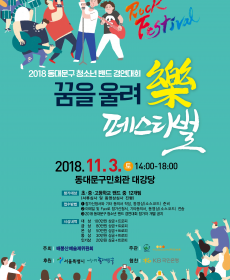 미리보기2018년11월3일(토)오후2시부터6시까지서울동대문구에위치한동대문구민회관대강당에서‘꿈을울려樂(청소년이여,꿈을울려라)’란슬로건으로‘2018동대문구청소년밴드경연대회’가열린다.서울특...