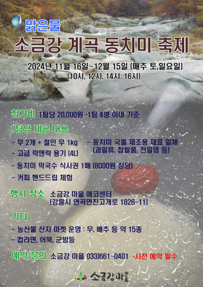 강원도 강릉시 연곡면 소금강마을에서 ‘맑은물 소금강 계곡 동치미 축제’가 오는 16일부터 12월 15일까지 매주 토, 일요일마다 열린다.