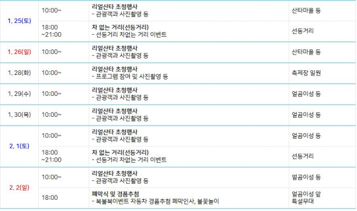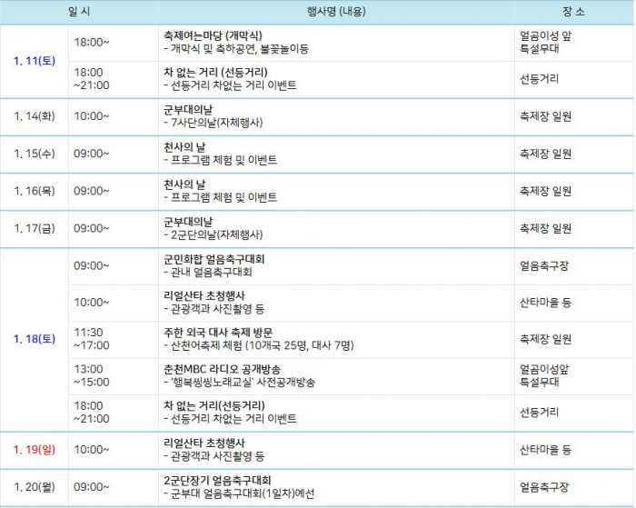 ①여는마당(개막식) ②겨울문화촌 ③산타우체국 이동점 ④리얼 산타 초청 ⑤천사의날 ⑥호국이의날 ⑦호국이 체험존 ⑧화천 조경철 천문대 홍보관 ⑨에티오피아 장학사업 홍보관 ⑩화천 복불복 경품 이벤트 ⑪밤낚시 최대어 이벤트 ⑫깜짝 이벤트 ⑬얼곰이 캐릭터 이벤트 ⑭SNS 산천어 라이브 방송 ⑮산천어 게임 ⑯얼음축구 대회 ⑰화천고 과학실험교실 ⑱주거정책홍보관 ⑲축제 포토존 ⑳닫는마당