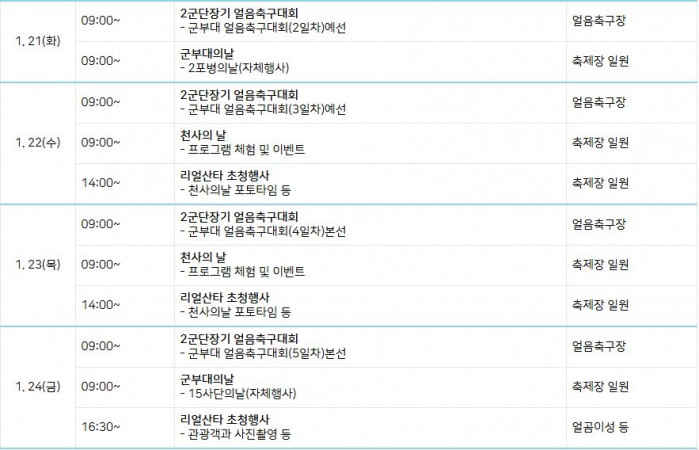 ①눈썰매 ②아이스 봅슬레이 ③얼곰이성 ④얼곰이성 미끄럼틀 ⑤얼곰이성 눈조각 ⑥세계얼음썰매 체험존 ⑦산천어코스 하늘가르기 ⑧겨울스포츠존(얼음축구,파크골프) ⑨얼곰이 피겨 스케이트 ⑩빙판 버블슈트 체험 ⑪산타마을 ⑫산천어 트리포토존