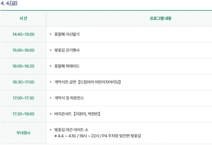 • 벚꽃길 함께 걷기, 차없는 거리 버스킹 공연, 강서구 생활문화연합회 공연, 벚꽃 라디오 방송, 벚꽃제방길 라이트쇼, 가족과 함께하는 연날리기, 하모니(통기타, 하모니카) 공연 등