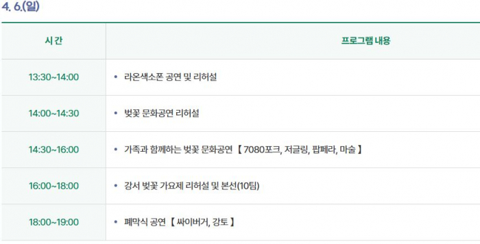 • 강서 벚꽃가요제, 강서벚꽃 ROCK 콘서트, 전국 청소년 트로트 가요제, 청소년 K-POP 댄스경연대회, 합창페스티벌, 가족과 함께하는 벚꽃 문화공연, 버지콘서트, 무대참여 레크레이션 등