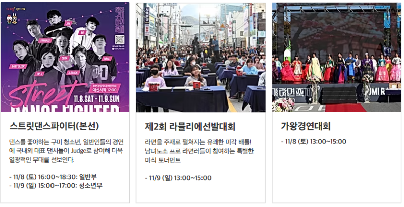 금년에는 11월 7일~11월 9일까지 3일간 구미역을 중심으로 금오산 잔디광장, 문화로, 금리단길, 구미역 후면광장 등 다양한 공간에서 콘텐츠를 즐길수 있도록 계획하고 있습니다.