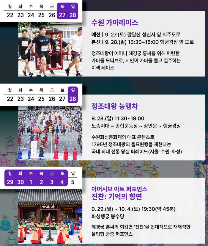 수원화성문화제는 1795년, 정조대왕이 어머니 혜경궁 홍씨의 회갑을 축하하기 위해 직접 기획하고 진행한 8일간의 화성행행을 현대적으로 재해석한 축제입니다.