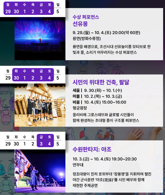 그 여정을 따라 과거와 현재가 만나는 역사문화축제로 열립니다. 《원행을묘정리의궤》에 기록된 야간 군사훈련 ‘야조’,회갑 잔치 ‘진찬연’, 특별 과거시험 ‘별시’,효와 장수를 기리는 ‘양로연’ 등 정조가 설계한 다채로운 행사들을 모티브로, 오늘의 수원화성문화제는 정조의 기획력과 비전을 계승하고, 현대적 감각으로 풀어낸 축제의 장이 됩니다.