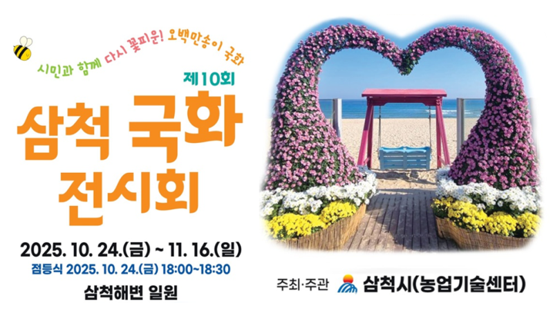 올해로 10회째를 맞는 삼척 국화전시회는 국화 조형작과 다륜작 등 총 10,500여 점의 국화 작품을 전시해 방문객들의 눈길을 사로잡는다. 또한 지역 농특산물 홍보 및 판매 부스, 국화 향기를 느낄 수 있는 체험부스 운영과 함께 관내 공연동아리의 거리공연도 다채롭게 펼쳐진다.