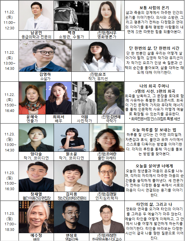 이번 축제의 대표 프로그램인 인문 토크콘서트 ‘다정한 대화’에서는 서로 다른 분야의 연사들이 한자리에 모여 단절된 시대에 나와 타인, 사회를 잇는 다정한 시선을 회복하기 위한 메시지를 전한다.