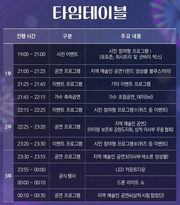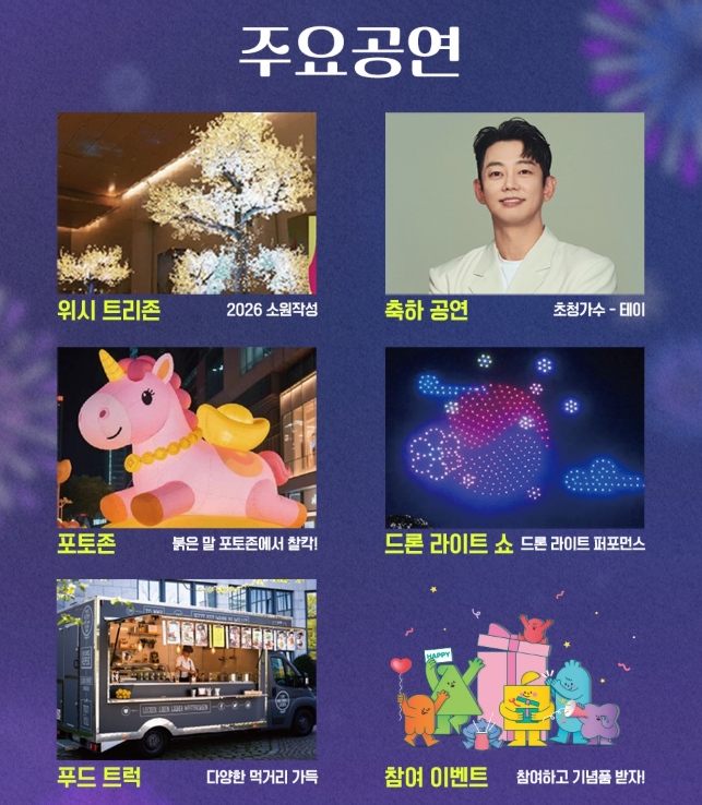 특히 ‘사랑은… 향기를 남기고’, ‘같은 베개’ 등으로 많은 사랑을 받은 가수 테이의 축하 공연이 펼쳐지며, 행사장 주변에는 지난 한 해의 기억을 정리하고 새 출발을 기원하는 의미를 담은 ‘기억 분리수거함’과 ‘소원 트리’가 설치된다. 이와 함께 한 해의 마무리와 새해의 희망을 상징적으로 표현한 드론 라이트 쇼가 밤하늘을 수놓는다.