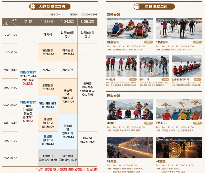 · 얼음놀이 : 얼음썰매, 외발썰매, 이색컬링, 팽이치기, 얼음판 줄다리기