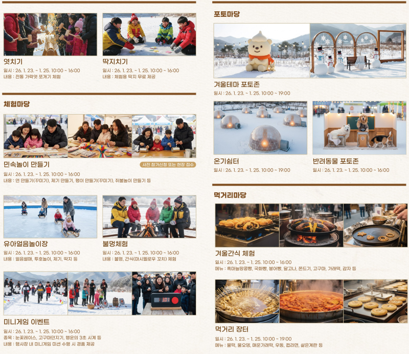 · 체험마당 : 전통놀이 만들기, 겨울간식 체험, 유아얼음놀이장, 불멍존, 미니게임
