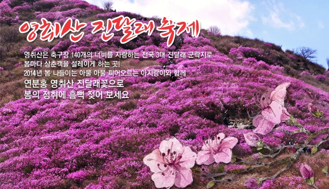 • 영취산 진달래 절정 개화 시기는 2014. 3. 24. ~ 4. 13. 입니다.