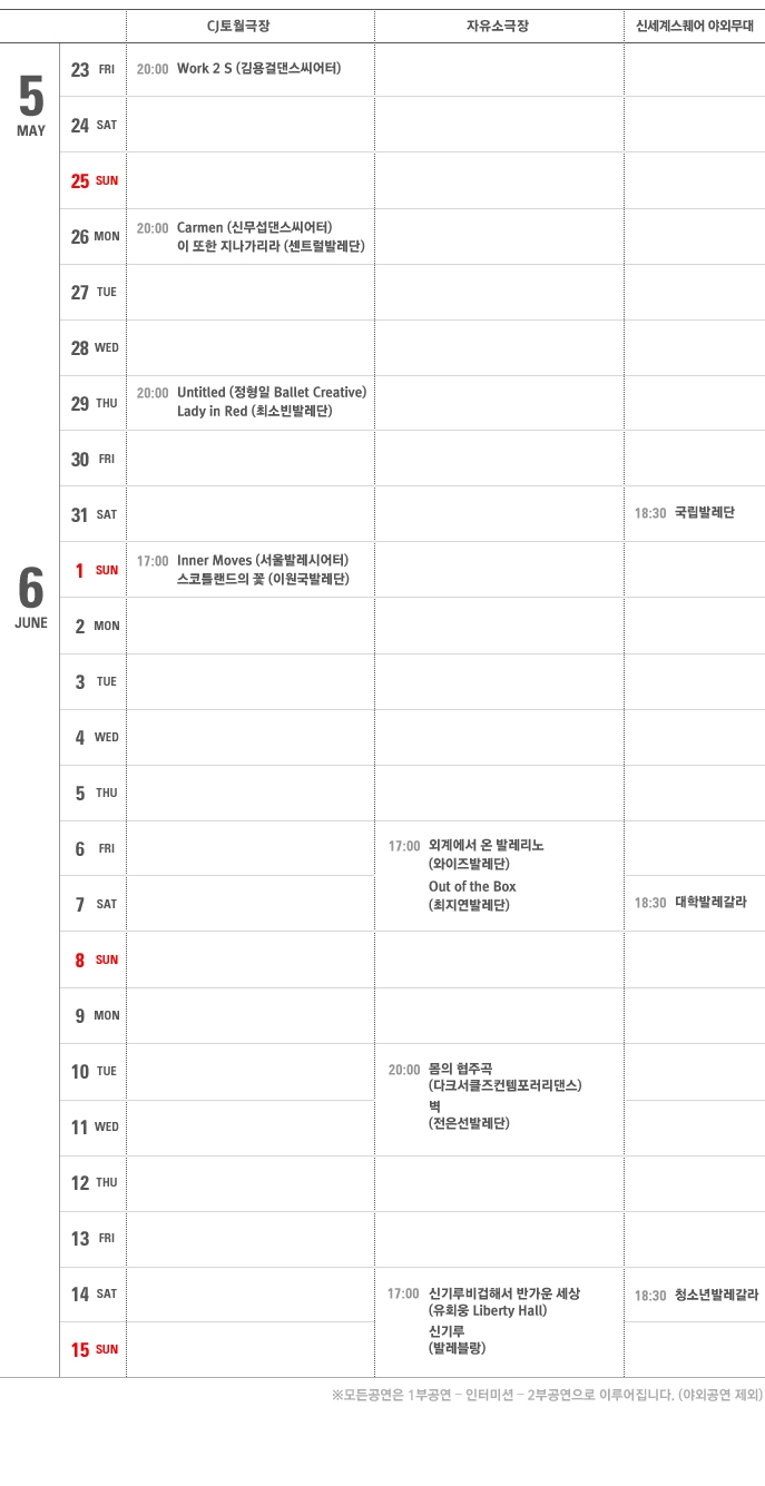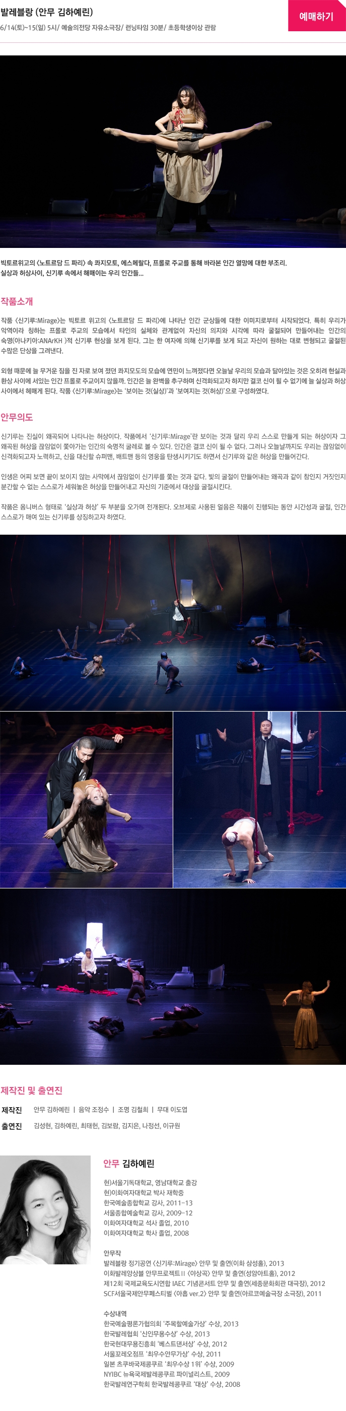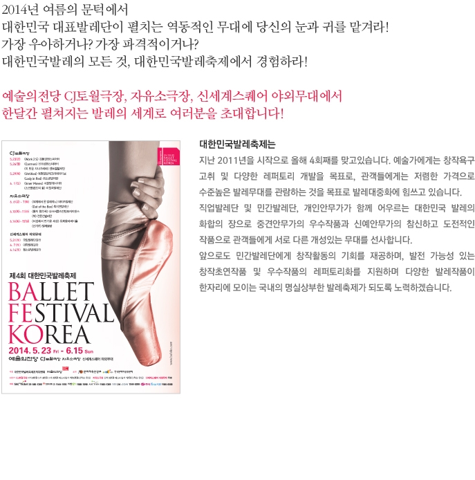 2014년 여름의 문턱에서 대한민국 대표발레단이 펼치는 역동적인 무대에 당신의 눈과 귀를 맡겨라! 한달간 펼쳐지는 발레의 세계로 여러분을 초대합니다!