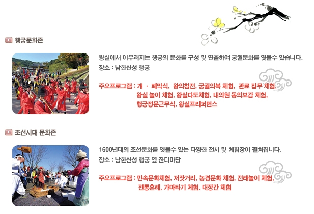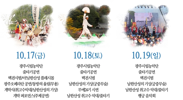 남한산성이 유네스코 세계문화유산 등재되고 첫 번째 문화축제가 열린다. 백제를 창건한 온조대왕의 불굴의 의지와 이서 장군의 구국의 혼을 기리는 제향을 열고, 광지원농악의 공연도 있다. 호궤의식이 행궁에서 열리고, 퍼레이드가 압권이다.