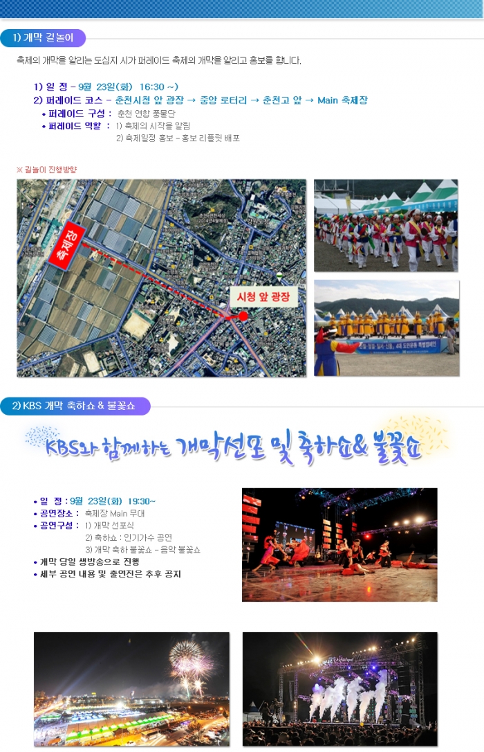| 19:00~20:00 | 19:30~21:00 KBS 개막 축하쇼 | - 한국밸리댄스 공연 - GBN 강원방송 - cj헬로비전 춘천닭갈비 막국수 가요제 (연예인축하공연) | - 시니어무용단 봉사단 "동행" - 김찬수 마임 - 아이엠 매직 마술공연 - 힙합 슈퍼소닉 - 훈남스 밴드 | - 오프닝 "진로이벤트" - 비보이 스탠딩피플 - 이집트 밸리댄스 - 팡타스틱 쇼 | ||