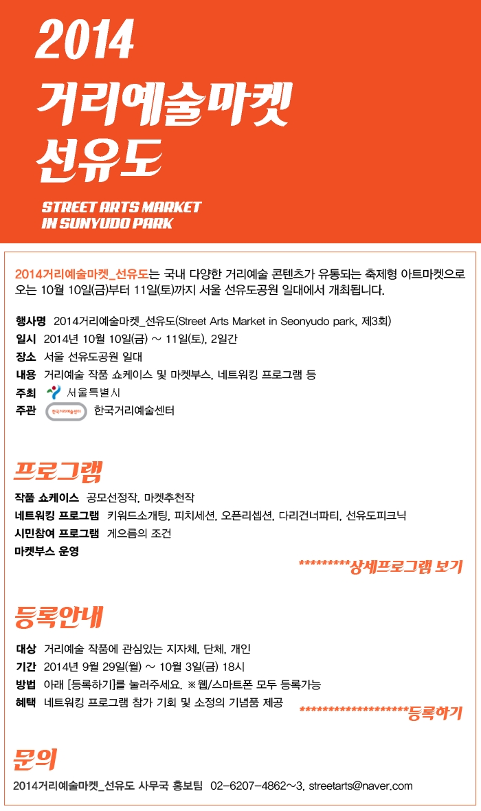 ‘2014거리예술마켓_선유도’는 다양한 형태로 거리예술의 영역을 확장하는 공모선정작이 선을 보이고 동시대인들의 삶과 그 모임에 적극적인 개입을 계획하는 창작자들과 관계기관들이 홍보부스를 운영한다. 또한 각종 네트워킹 프로그램을 운영함으로서 거리예술가들과 관련기획자들의 관계 맺기를 주도해 나갈 것이다. ‘2014거리예술마켓_선유도’가 거리예술 콘텐츠의 활발하고 건강한 유통을 활성화 시키고 다양한 인적교류의 장이 되길 기대한다.