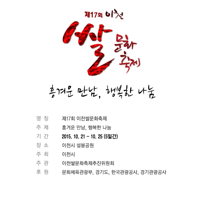 | 14:00 | 풍년마당이천풍물놀이 동화마당어린이 인형극 문화마당봉산탈춤 햅쌀거리진상마차 놀이마당불난타/신명풀이 | 기원마당강강수월래 농경마당풍년콘서트 쌀밥카페가마솥이천명이천원 세계쌀요리경연 동네마당씨름왕선발대회 |