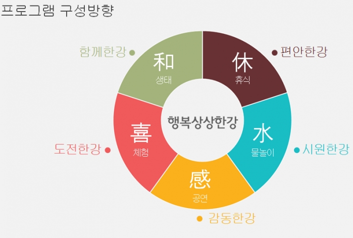 시원한강(수상레포츠), 감동한강(공연,퍼포먼스), 함께한강(생태체험), 도전한강(경연,게임), 편안한강(캠핑,휴식)