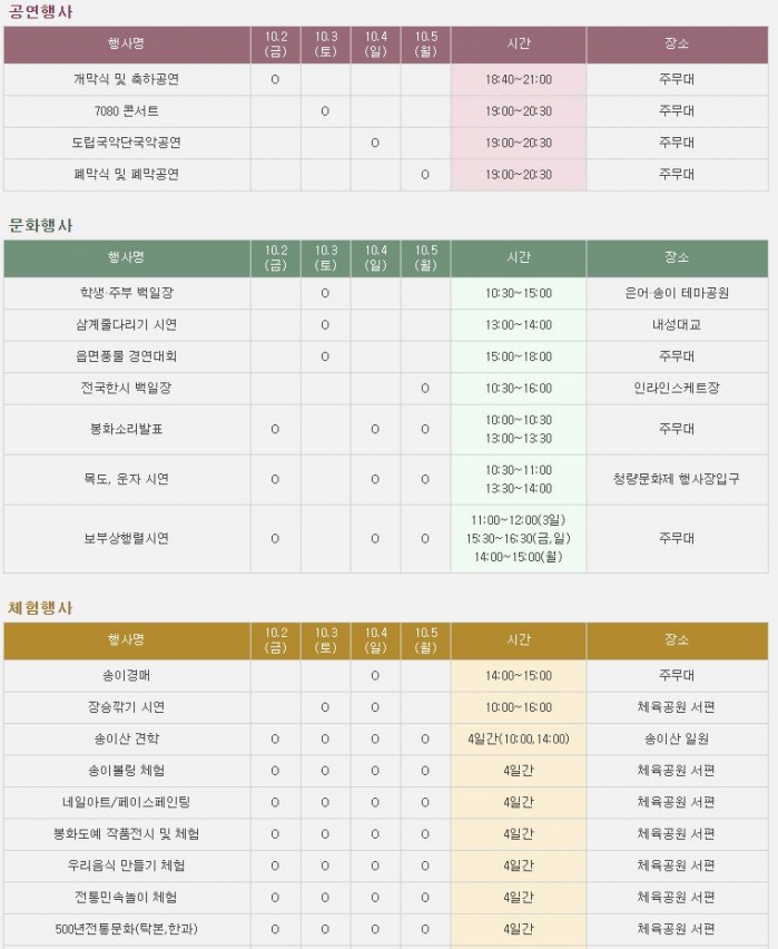 | 공연행사 | 개막축하공연, 7080콘서트, 송이가요제, 폐막공연 등 |
