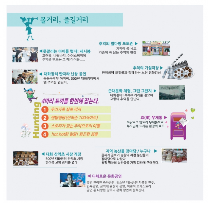 대화전통시장에서는 골목길 7080 음악회를 들으며 옛날 다방을 재현한 “별다방”에서 추억의 커피를 마실 수 있으며 7080년대의 대화장터의 풍경을 바탕으로 과거로의 여행을 즐길 수 있다.