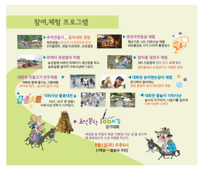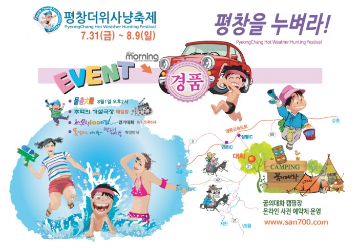 대화면 전통시장과 땀띠공원 일원에서 펼쳐지는 이번 축제는 평창더위사냥축제위원회(위원장 김창수)에서 주관하고 평창군과 대화면 기관단체의 후원으로 열린다.