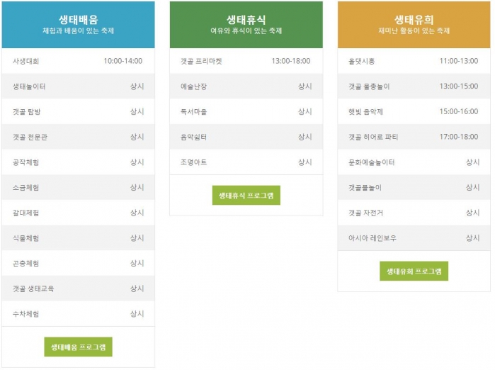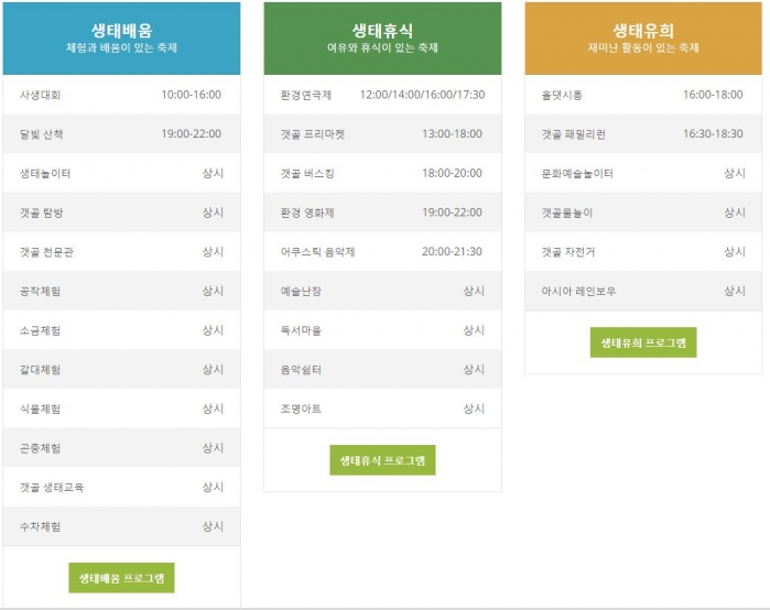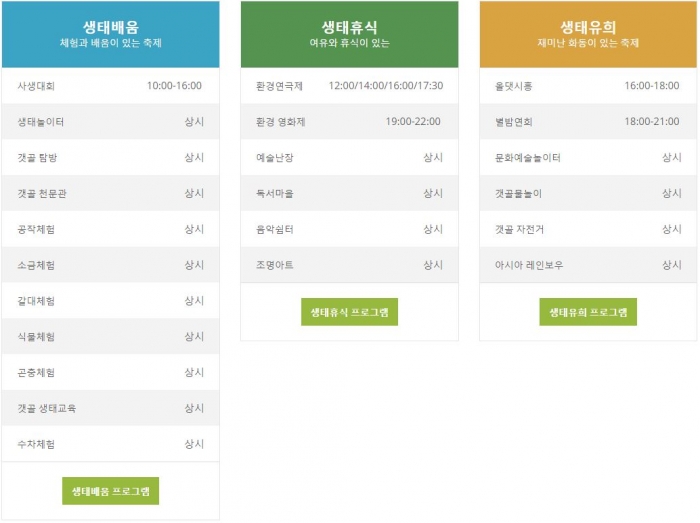 올해 10회를 맞는 시흥갯골축제는 ‘자연 속 31가지 생태놀이’라는 컨셉을 가지고 갯골자연에서 쉬고 배우며 즐기는 축제가 될 수 있도록 기획했다. 다채로운 프로그램을 ‘생태배움’, ‘생태휴식’, ‘생태유희’ 의 3가지 테마로 구분하여 진행한다.