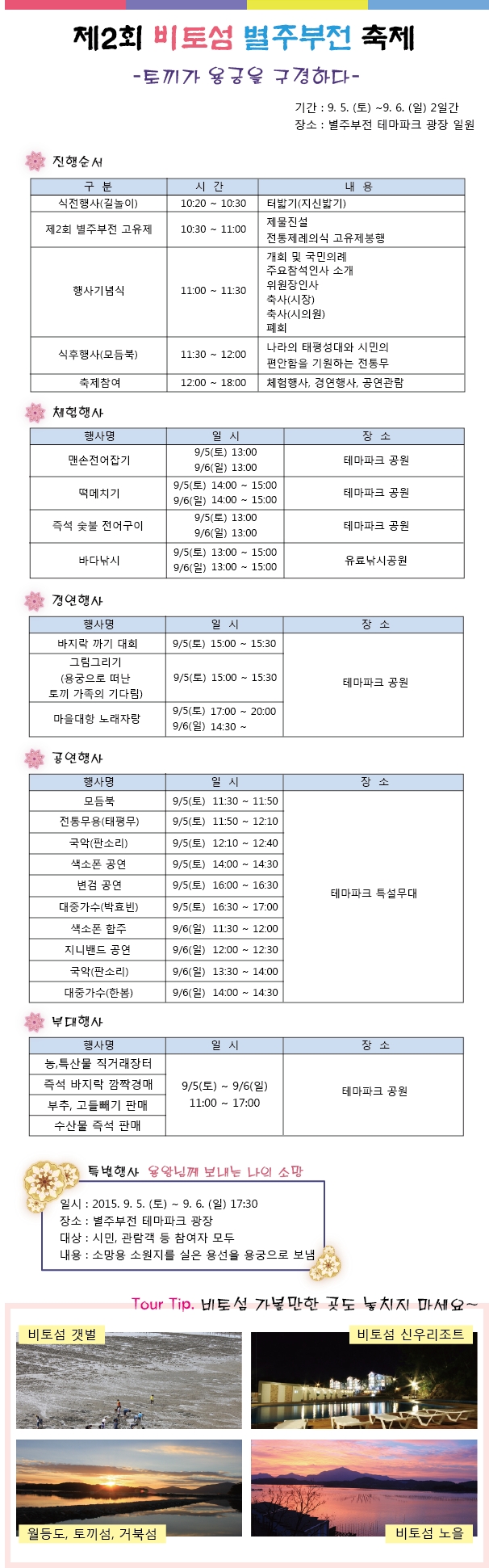 이번 축제는 ‘2015년 사천시 관광교통과의 지역브랜드 공모사업’에 선정되어 태고의 모습을 간직하고 있는 신비의 섬이자 별주부전의 모태인 ‘비토섬’을 주제로 열린다.