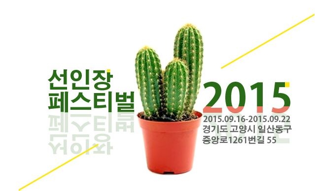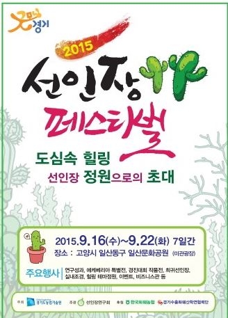 세계로 수출하는 경기 선인장을 알리고 소비를 촉진하는 농업축제인 「2015 선인장페스티벌」은 올해 12회째로 고양시 일산문화공원에서 진행된다. 이번 행사는「도심속 힐링, 선인장 정원으로의 초대」라는 주제로 선인장과 관련된 다채로운 볼거리와 체험이벤트가 펼쳐진다. 경기도에서 개발한 신품종 등 연구성과를 비롯한 희귀선인장, 다육식물 모둠작품, 에케베리아 특별전 등을 볼 수있으며 다양한 선인장 테마정원을 만날 수 있다. 이밖에도 다육식물 모둠화분을 직접 만들어보는 무료체험행사와 선인장 화분 만들기, 비누만들기 등 다양한 체험 프로그램도 즐길 수 있다. 또한 행사기간중 소비자들이 농가에서 생산한 선인장과 가공상품을 저렴하게 구입할 수 있는 판매장도 운영할 예정이다. 도심속 선인장페스티벌을 통해 선인장의 아름다움과 힐링을 체험할 수 있을 것으로 기대된다.