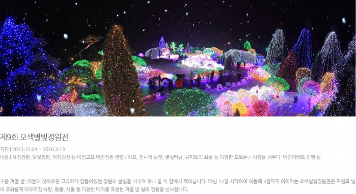 또한 올해 새로 조성된 아침광장의 파도물결 구름다리, 잣나무 쉼터, J의 오두막 정원 등 조명 설치 구역을 넓혀 더욱 커지고 화려한 축제를 감상할 수 있다.