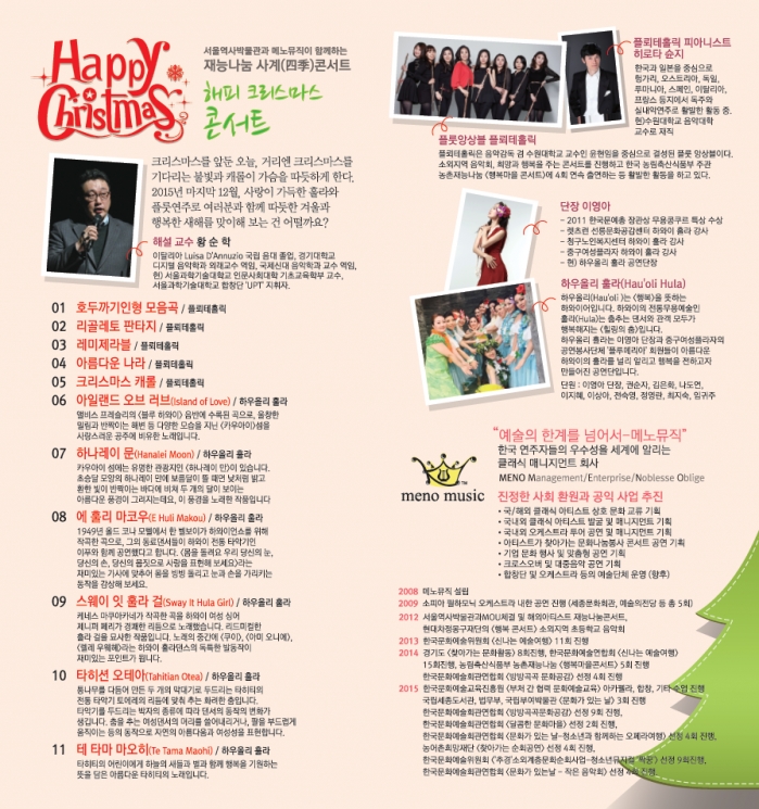 이번 공연에는 크리스마스의 분위기를 물씬 느낄 수 있는 음악뿐만 아니라 하와이 전통무용예술까지 즐길 수 있어 추운 겨울 메마른 감성을 포근하게 만들어줄 것이라고 서울역사박물관과 메노뮤직은 말했다.