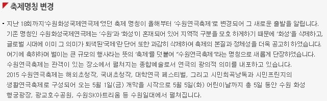 18회까지 ‘수원화성국제연극제’였던 축제 명칭이 19회부터 ‘수원연극축제’로 변경되었습니다. 기존 명칭인 수원화성국제연극제는 ‘수원’과 ‘화성’이 혼재되어 지역적 구분을 모호하게 만들기 때문에 ‘화성’을 삭제하였습니다. 또한 세계화시대에 의미가 많이 퇴색한 ‘국제’라는 단어를 삭제하고, 축하하며 벌이는 큰 규모의 행사라는 뜻의 ‘축제’를 덧붙여 축제의 본질과 정체성을 더욱 공고히 하였습니다.