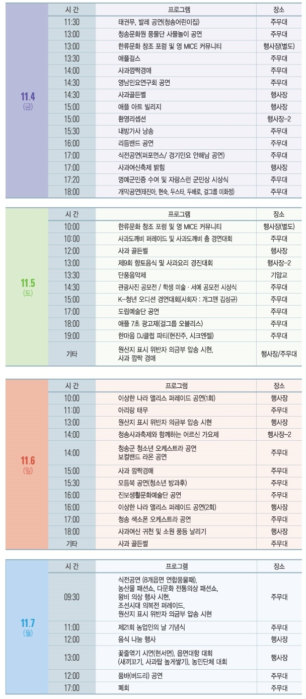 최우수 축제로 선정된 청송 사과축제(청송군/청송군축제추진위원회)는 11월 4일부터 11월 7일까지 4일간 청송읍 사과테마공원 일원에서 개최된다. 이 축제는 판매 위주의 타 농산물 축제와는 달리 전국 최고의 맛을 자랑하는 청송사과에 지역문화콘텐츠를 결합한 축제다. 대표 프로그램으로는 사과도깨비 퍼레이드, 사과도깨비 춤 경연대회를 비롯하여 사과따기 체험, 사과요리 체험, 깜짝 사과 경매, 청송사과 3가지맛 체험 등이며 사과체험관 운영, 청송사과 레크레이션, 청송사과선별기체험, 외국인 과수농가체험, 애플스토리하우스 등 다양한 체험행사도 펼쳐진다.