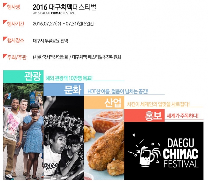 대구치맥페스티벌은 치킨산업의 발생지인 대구의 치킨과 무더운 여름철 시원한 맥주를 소재로 하여 매년 7월에 개최되는 대구시 대표축제로서 치킨업체와 맥주업체의 제품을 전시•판매하고 K-pop 공연 및 락페스티벌 등 다양한 공연행사와 치킨요리 공연 및 페이스 페인팅 등 참여행사와 함께 치킨산업 발전을 위한 학술행사도 개최하는 등 문화•산업이 함께 어우러지는 시민축제로 개최된다.
