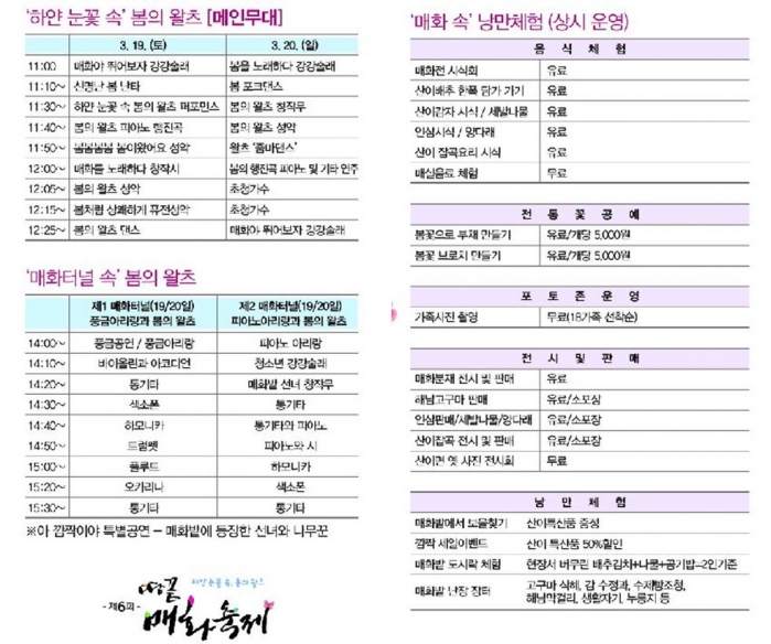 ○ 주요프로그램: 매화터널 공연, 각종 체험행사, 추억의 도시락 먹기 등