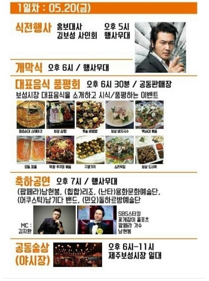 1일차(5.20 금) : 홍보대사 김보성 사인회, 개막식 및 축하행사, 대표음식 품평회, 공동술상(야시장)
