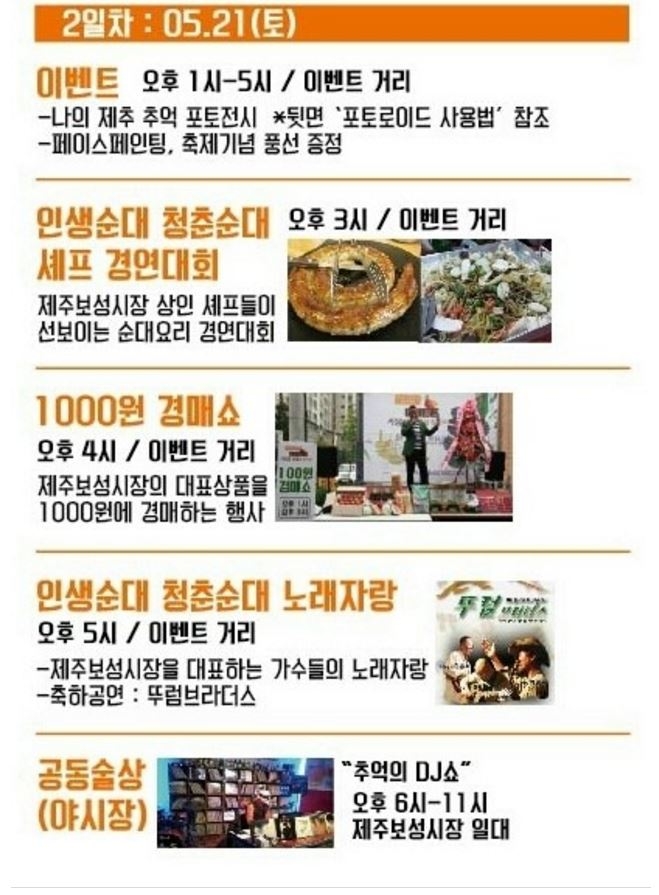 2일차(5.21 토) : 나의 제주추억 포토전시, 순대페이스페인팅, 인생순대 청춘순대, 셰프경연대회, 1,000원 경매쇼, 노래자랑, 추억의 DJ쇼, 공동술상(야시장)