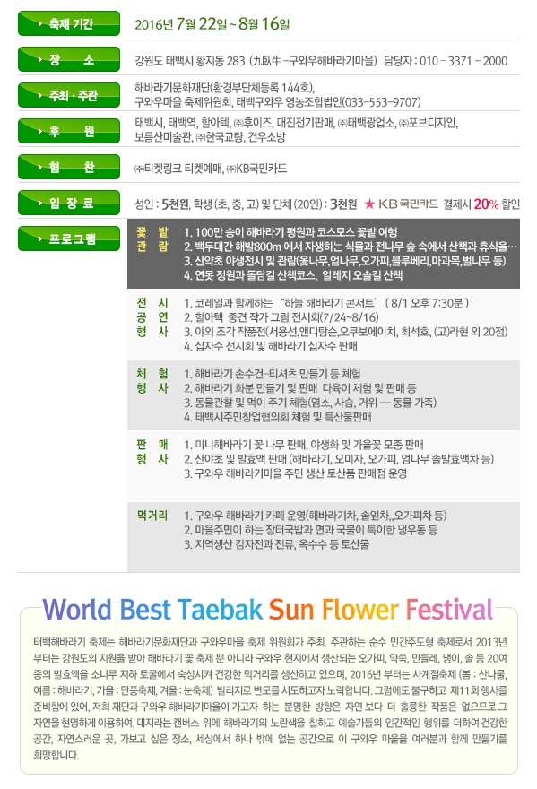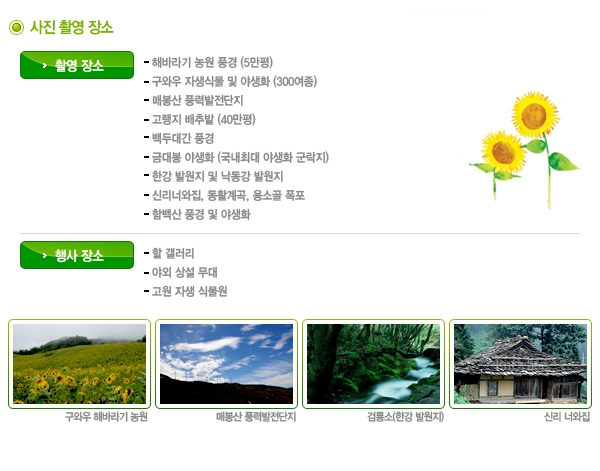 태그구와우 해바라기 농원할 갤러리고원자생식물원신리너와집풍력발전단지태백축제구와우해바라기마을