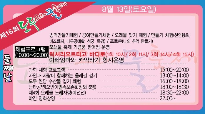 - 기타프로그램 : 오래물전국노래자랑 및 사진촬영대회, 원담수산물잡기 등