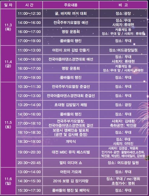 - 부대행사: 보령시 특산물 장터, 지역 우수단체 먹거리촌, 군고구마 시연장, 수산물 홍보 판매 등